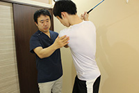 スイングに重要な姿勢と軸をチェックし、動きの癖を探ります。姿勢と軸のズレからくる動きの異常が、step1の痛みのメカ ニズムと、どのように関わっているかを分析し、それをもとに施術に入ります。
